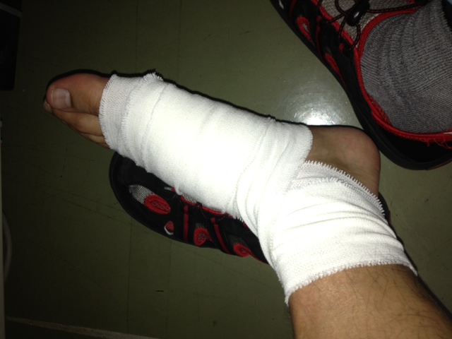 先ほど病院でレントゲン写真を見ましたが、ハイ ポッキリ折れておりました。左足第5中足骨基部骨折・・・